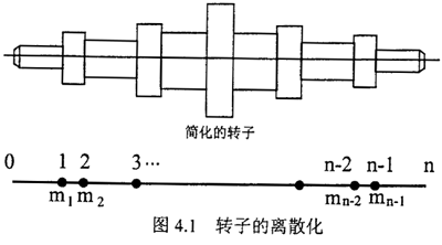 一個(gè)實(shí)際轉(zhuǎn)子,可以看作由一根變截面的軸和分布其上的若干圓盤(pán)所組成。用集總質(zhì)量法,可將其離散成n段無(wú)質(zhì)量的彈性軸和n-1個(gè)集總質(zhì)量。如圖4.1所示。具體過(guò)程見(jiàn)文獻(xiàn)。