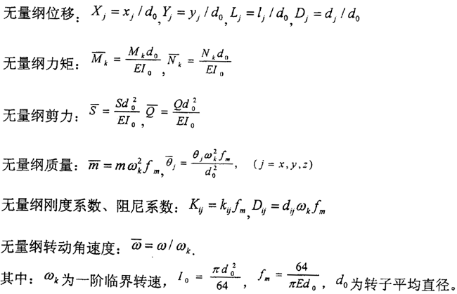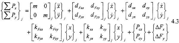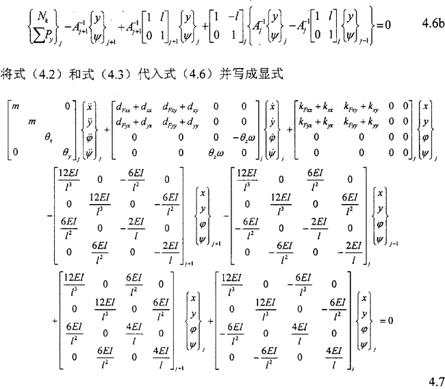 式4.3中右端第一項(xiàng)為慣性力:三、五兩項(xiàng)為滑動(dòng)軸承的油膜力;二、四兩項(xiàng)為外加阻尼力及剛度力……,Pcx,Pcy則代表與系統(tǒng)本征值無(wú)關(guān)的外加激勵(lì)力、不平衡力、重力或其它控制力。ΔFx,ΔFy為齒輪動(dòng)態(tài)嚙合力在x、y方向上的分量。當(dāng)所簡(jiǎn)化的質(zhì)點(diǎn)是各向同性時(shí),其直徑轉(zhuǎn)動(dòng)慣量θx=θy=Jd,極轉(zhuǎn)動(dòng)慣量θz=Jp。