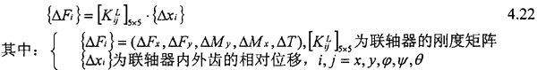 因此通過(guò)聯(lián)軸器的剛度[KijL]5×5(由第三章求得)把動(dòng)態(tài)力和力矩表示成內(nèi)外齒相對(duì)位移的顯函數(shù),從而得到齒輪聯(lián)軸器連接軸系的彎曲和扭轉(zhuǎn)振動(dòng)方程。