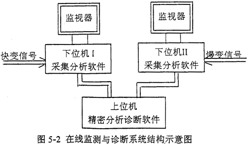 為了適應(yīng)日益更新的生產(chǎn)實(shí)際多種類型參數(shù)監(jiān)測(cè)和故障診斷的要求,建立由多臺(tái)微機(jī)并行運(yùn)行構(gòu)成的在線連續(xù)實(shí)時(shí)監(jiān)測(cè)與快速診斷系統(tǒng)。圖5-2為多微機(jī)在線監(jiān)測(cè)與診斷系統(tǒng)結(jié)構(gòu)示意圖。這樣做的優(yōu)點(diǎn)是:
