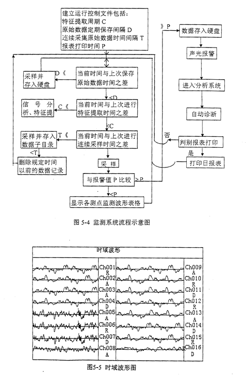軟件的各個(gè)模塊通過(guò)動(dòng)態(tài)數(shù)據(jù)和運(yùn)行狀態(tài)數(shù)據(jù)庫(kù)聯(lián)系在一起,在下位機(jī)中,監(jiān)測(cè)系統(tǒng)控制著動(dòng)態(tài)數(shù)據(jù)的采集、存儲(chǔ)、顯示和預(yù)處理,同時(shí)把監(jiān)測(cè)結(jié)果存入各機(jī)組運(yùn)行狀態(tài)特征數(shù)據(jù)庫(kù)。在上位機(jī)中,詳細(xì)分析診斷程序塊調(diào)用運(yùn)行狀態(tài)數(shù)據(jù)庫(kù),得出診斷結(jié)果并調(diào)用打印程序塊輸出。圖5-3為數(shù)據(jù)流程示意圖,圖5-4為監(jiān)測(cè)系統(tǒng)流程示意圖。