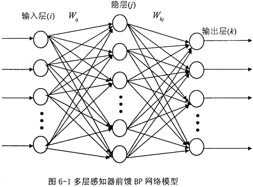 BP算法即是誤差反傳訓(xùn)練算法,它是一種有導(dǎo)師的訓(xùn)練算法,它在給定輸出目標(biāo)的情況下,按其實(shí)際輸出與目標(biāo)值之差的平方和為目標(biāo)函數(shù),通過(guò)調(diào)節(jié)權(quán)值使目標(biāo)函數(shù)達(dá)到最小值。多層感知器前饋BP網(wǎng)絡(luò)模型如圖6-1所示。