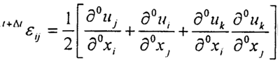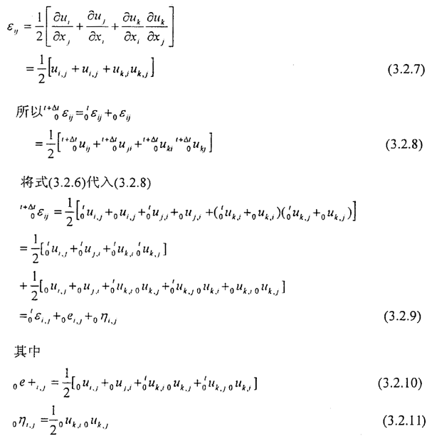 以t=0時(shí)刻為基準(zhǔn)描述物體在t+△t時(shí)刻的平衡,在平衡方程中采用格林—拉格朗日應(yīng)變分量 以及克;舴驈埩縯+ΔtSij,