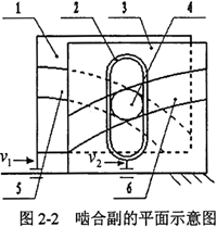 圓柱正弦活齒傳動(dòng)是空間傳動(dòng)機(jī)構(gòu),其空間正弦滾道具有周期性,將該傳動(dòng)沿圓柱直母線方向展開,則機(jī)構(gòu)的運(yùn)動(dòng)將轉(zhuǎn)化為如圖2-2所示的平面運(yùn)動(dòng)。由此,它的自由度計(jì)算可利用平面自由度公式進(jìn)行計(jì)算,主動(dòng)軸、導(dǎo)架及殼體相對于固定機(jī)架各有一個(gè)轉(zhuǎn)動(dòng)副,活齒與這三個(gè)構(gòu)件間形成三個(gè)高副,活齒本身存在一個(gè)局部自由度F′,則圓柱正弦活齒傳動(dòng)的自由度F為F=3n-2PL-PH-F′=3×4-2×3-3-1-2。由此可見,這是一個(gè)差動(dòng)機(jī)構(gòu),給定兩個(gè)原動(dòng)件,傳動(dòng)機(jī)構(gòu)才會(huì)有確定的運(yùn)動(dòng)。當(dāng)固定殼體、導(dǎo)架及主動(dòng)軸之一時(shí),傳動(dòng)機(jī)構(gòu)的自由度為1。在圖2-2中各部件的含義同圖2-1,若殼體固定,主動(dòng)軸為動(dòng)力輸入軸,當(dāng)主動(dòng)軸轉(zhuǎn)動(dòng)時(shí),主動(dòng)軸上的外正弦滾道推動(dòng)活齒運(yùn)動(dòng),在主動(dòng)軸外正弦滾道及殼體內(nèi)正弦滾道的共同約束限制下,活齒繞公共軸線的圓周方向作等速運(yùn)動(dòng),同時(shí)推動(dòng)導(dǎo)架的活齒槽,由導(dǎo)架輸出動(dòng)力。