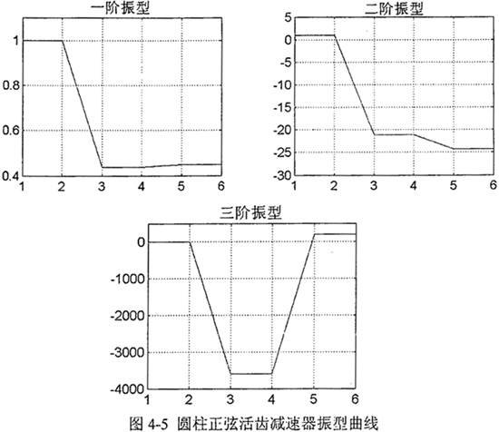 根據(jù)式(4-9)、(4-10)及(4-12)計(jì)算出固有頻率、勢(shì)能分布率和模態(tài)柔度見(jiàn)表4-2。利用Matlab編制程序還繪制出圖4-5所示的減速器系統(tǒng)的振型曲線(xiàn)。