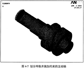 四面體單元每個(gè)節(jié)點(diǎn)有三個(gè)自由度(Tx,Ty,Tz),通過(guò)限制節(jié)點(diǎn)的自由度,對(duì)模型施加約束。模擬軸承的作用,在安裝軸承處的零件表面施加約束,首先將表面上所有節(jié)點(diǎn)的坐標(biāo)由笛卡爾坐標(biāo)(x,y,z)轉(zhuǎn)換為柱坐標(biāo)(R,θ,Z),然后限制自由度R。并在主動(dòng)軸的輸入軸端面和導(dǎo)架的輸出軸端面,限制所有節(jié)點(diǎn)的自由度。劃分網(wǎng)格并施加約束的主動(dòng)軸見(jiàn)圖4-7。