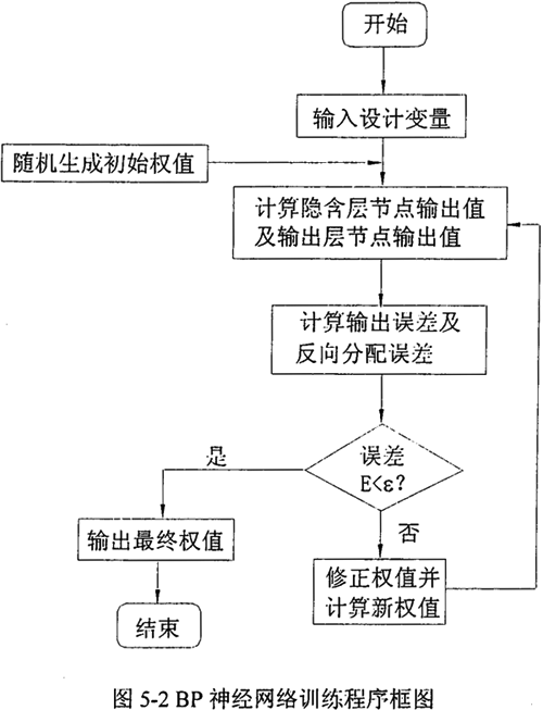 三層前饋型BP網(wǎng)絡(luò)采用BP算法來調(diào)整網(wǎng)絡(luò)連接權(quán)值和節(jié)點閾值。BP算法,即誤差逆?zhèn)鞑W(xué)習(xí)方法,是一種曲型的誤差修正方法。BP算法是一個種有教師的學(xué)習(xí)算法,整個網(wǎng)絡(luò)學(xué)習(xí)過程由信息的正向傳動播和誤差的反向傳播兩上階段構(gòu)成,在正向傳播的過程中,輸入信息從輸入層經(jīng)隱含層逐層處理,并傳向輸出層,如果不能在輸出層得到期望的輸出,則轉(zhuǎn)入反向傳播,運用梯度下降法連接權(quán)關(guān)于誤差函數(shù)的導(dǎo)數(shù)沿原來的連接通路返回,通過修改各層的權(quán)值使得誤差函數(shù)減小,直到達到收斂為止。神經(jīng)網(wǎng)絡(luò)練過程如圖5-2所示。