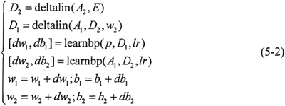 (3)計算各層反向傳播的誤差變化D1、D2,并計算各層權(quán)值的修正值及新的權(quán)值: