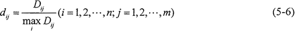 2.求轉(zhuǎn)換樣本矩陣 即象矩陣 由于指標(biāo)不同,要求不同,因此有必要按上限效果測度、下限效果測度、中心效果測度來統(tǒng)一樣本。當(dāng)指標(biāo)要求“越大越好”時,可用上限效果測度,記統(tǒng)一后的樣本為dij,則有