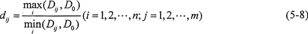 對于式(5-4),若存在x*使f1(x),f2(x),…,fm(x)全部達到最小,則稱x*為理想解。在多目標(biāo)優(yōu)化設(shè)計中,由于目標(biāo)函數(shù)間相互制約,往往得不到理想解,而滿意解也不止一個,因此定義最接近理想解的滿意解為最滿意解。應(yīng)用灰色聚類分析方法求解多目標(biāo)優(yōu)化設(shè)計中的最滿意解,具體步驟如下所示: