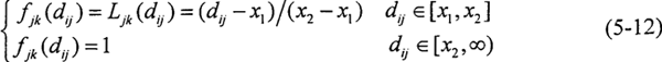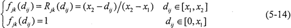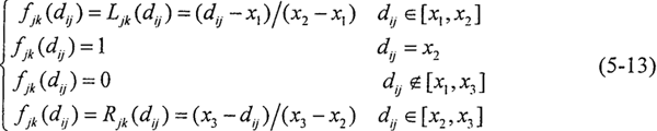 4.進行灰色聚類 對象矩陣進行聚類,聚類類別選為“1”、“2”、“3”三類時,其白化權(quán)函數(shù)分別與式(5-12)~(5-14)和圖5-4對應(yīng)。