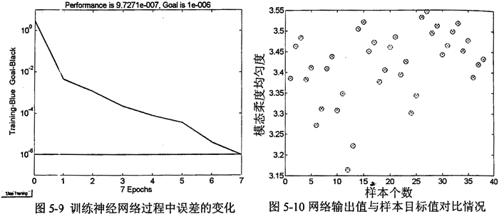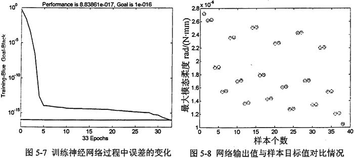 進(jìn)行動態(tài)優(yōu)化時,若要建立起目標(biāo)函數(shù),首先要獲得一組能夠精確計算f4(x)的權(quán)值,這就需要通過樣本訓(xùn)練BP神經(jīng)網(wǎng)絡(luò),當(dāng)誤差精度達(dá)到要求時,訓(xùn)練停止,并得到了該組權(quán)值,利用該組權(quán)值與設(shè)計變量通過三層BP網(wǎng)絡(luò)可以計算出訓(xùn)練后的分目標(biāo)函數(shù)值f4(x)。在訓(xùn)練神經(jīng)網(wǎng)絡(luò)時,學(xué)習(xí)速率取為0.01,動量常數(shù)取為0.9,目標(biāo)誤差取為l×10-16。當(dāng)訓(xùn)練結(jié)束時,網(wǎng)絡(luò)輸出值與樣本目標(biāo)值之間的誤差均方根值為8.8386×l0-17(見圖5-7),訓(xùn)練過程誤差的變化情況及訓(xùn)練完成后網(wǎng)絡(luò)輸出值與樣本目標(biāo)值對比情況如圖5-8所示。