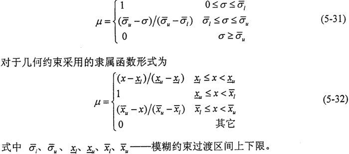 無論選擇何種形式的隸屬函數(shù),都需要確定模糊過渡區(qū)間的上、下界。為此,首先需要確定過渡區(qū)間的容差。所謂容差,即為過渡區(qū)間的總長度,實際上就是約束限制的容許偏差。確定容差的方法有概率分析法、模糊綜合評判法、擴(kuò)增系數(shù)法等。前兩種方法需要有足夠的統(tǒng)計分析資料,工程中常用的是擴(kuò)增系數(shù)法。擴(kuò)增系數(shù)法是在充分考慮以往普通設(shè)計規(guī)范和設(shè)計經(jīng)驗的基礎(chǔ)上,通過引入擴(kuò)增系數(shù)β(包括上增擴(kuò)系數(shù)