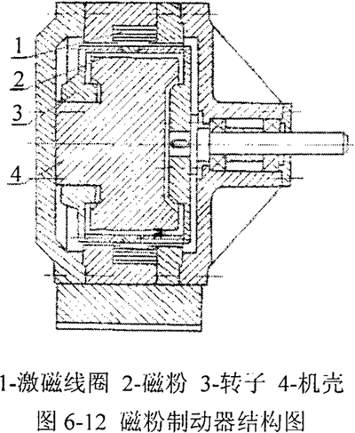 采用磁粉制動(dòng)器作為試驗(yàn)的加載裝置。磁粉制動(dòng)器由轉(zhuǎn)子、機(jī)殼、激磁線圈、磁粉組成,其結(jié)構(gòu)如圖6-12所示。在激磁線圈不通電流時(shí),不產(chǎn)生磁通,磁粉呈自由狀態(tài)。當(dāng)軸轉(zhuǎn)動(dòng)時(shí),由于離心力的作用,使磁粉散布在轉(zhuǎn)動(dòng)件與機(jī)殼之間,若此時(shí)激磁線圈通電流,則在線圈周圍產(chǎn)生磁場(chǎng),轉(zhuǎn)動(dòng)件與機(jī)殼間的磁粉沿磁通方向連接成鏈狀,由于磁粉間的結(jié)合力,使工作面之間產(chǎn)生摩擦力,從而形成制動(dòng)力矩,起到加載的作用。該力矩與激磁電流的大小基本成正比,故通過調(diào)節(jié)激磁線圈的電流大小可在一定范圍內(nèi)改變制動(dòng)力矩的大小。