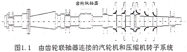 以往在對軸承一轉子系統(tǒng)進行動力學分析的過程中,對于構成系統(tǒng)的一些典型部件,如轉子、支承軸承、密封以及基礎都作過較深入的研究,但對于聯(lián)軸器耦合效應的討論卻不多。直觀地講,多跨轉子正是依賴多個聯(lián)軸器才得以構成大型系統(tǒng)的,因此更確切地講對于大型的多跨(或分跨)轉子系統(tǒng)可以稱為軸承—轉子—聯(lián)軸器系統(tǒng)。以大型的汽輪發(fā)電機組和壓縮機組為例,汽輪發(fā)電機組在低壓轉子、發(fā)電機轉子以及勵磁機轉子間均采用了剛性或半撓性聯(lián)軸器結構;對于壓縮機組,在壓縮機轉子和驅動設備如驅動汽輪機轉子或電機轉子之間也要采用不同形式的聯(lián)軸器。圖1.1所示是一透平壓縮機組的簡圖,為一典型的軸承—轉子—齒輪聯(lián)軸器系統(tǒng),整體系統(tǒng)由一個CL型的齒輪聯(lián)軸器將汽輪機轉了和壓縮機主軸連接組成。