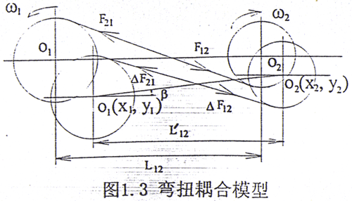 齒輪是機械系統(tǒng)中一個非常重要的部件,主要用于傳遞轉子之間的運動。對于外齒輪耦合轉子軸承系統(tǒng)的研究已經進行了數(shù)十年[14],比較典型的模型有Fukuma[15]、IWATSUBO[16]、Kahraman[17]模型和彎扭耦合模型[18],其中[15,18]中的模型分別如圖1.2和圖1.3所示。這些模型的共同特點是將嚙合的輪齒看成能夠產生變形的彈簧,同時考慮了齒輪中心的橫向位移和繞中心轉動的扭轉角位移,這樣對一個外齒輪而方Fukuma[15]模型就具有三個自由度,一對嚙合的外齒輪共有六個自由度;而彎扭耦合模型[18]則考慮了齒輪之間的嚙合關系,這一關系相當與給系統(tǒng)增加了一個約束,使得系統(tǒng)的自由度減少了一個,因此是一個五自由度模型。