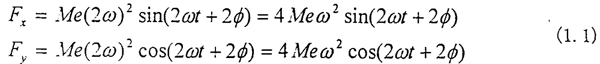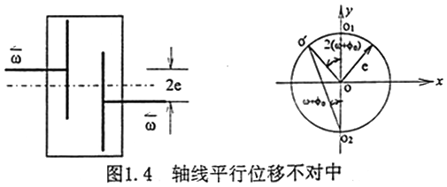 不對中具有一些典型的特征,如不對中比較嚴重時會使軸承的油膜壓力偏離正常值,聯(lián)軸器不對中時聯(lián)軸器兩端軸承的振動較大,軸心位置不穩(wěn)定,而且在振動頻譜中二倍頻分量幅值較大等。而對于齒輪聯(lián)軸器不對中產生倍頻振動分量的機理研究又是其中的一個重點。文獻[68]指出,由于安裝時轉子軸心線不對中引起的振動,在用電機驅動的轉子系統(tǒng)中,當電機軸與負載機械由齒輪聯(lián)軸器連接時,電機軸存在二倍頻的振動,而在單獨運動時,倍頻振動立即消失,這表明倍頻振動完全是齒輪聯(lián)軸器耦合的結果。文獻[64,65]解釋了由于齒輪聯(lián)軸器不對勁中而產生二倍頻振動的機理,以[65]中的軸線平行位移不對中為例見圖1.4,圖中ω為轉子的轉動的解速度,2e為不對中量,M為內齒套的質量,φ0為起始回轉角。