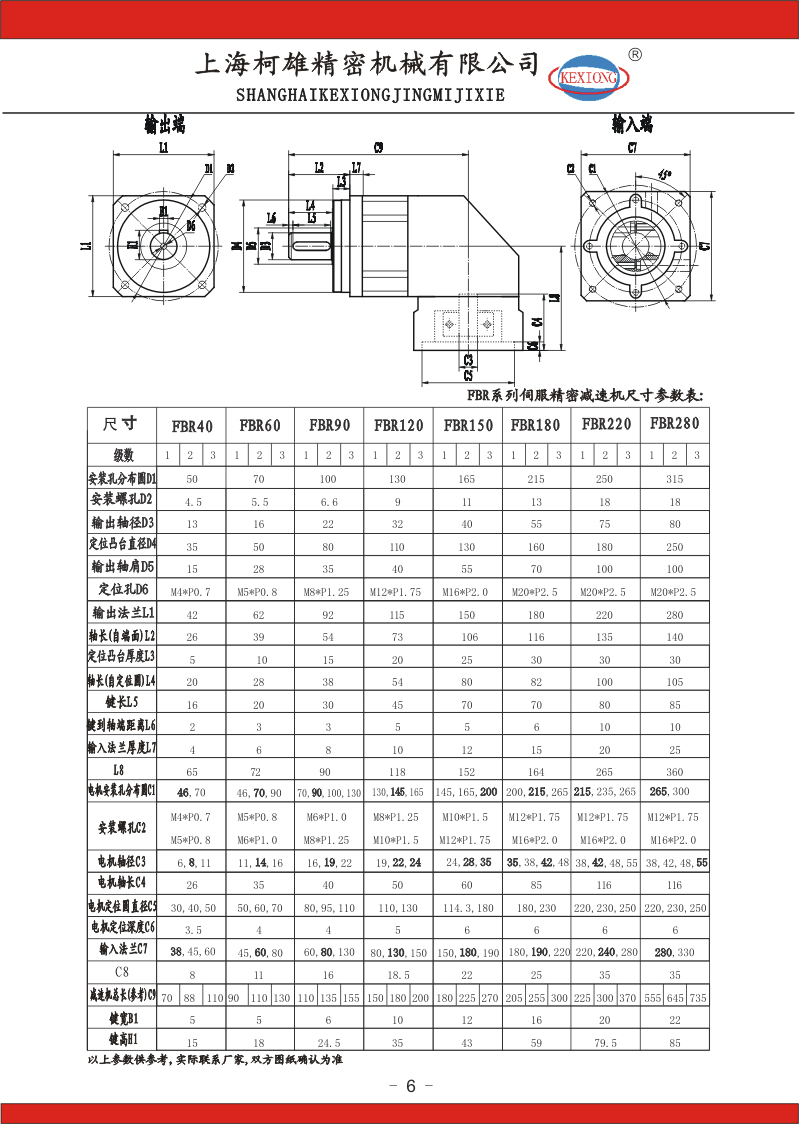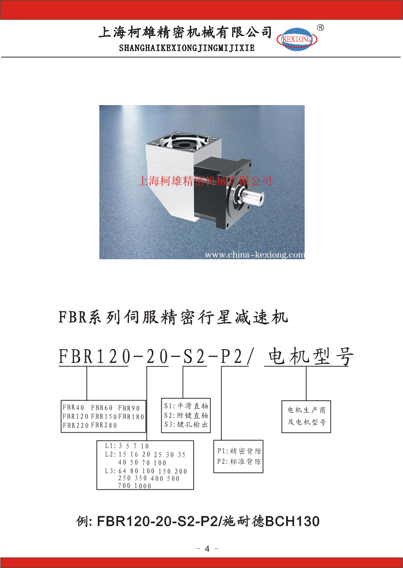FBR系列伺服直角行星減速器分: FBR40、FBR60、FBR90、FBR120、FBR150、FBR180、FBR220、FBR280、同軸式機座型號,速比:1-1000有20多個比速可選擇;分一、二、三級減速傳動;精度:一級傳動精度在4-6弧分,二級傳動精度在6-8弧分,三級傳動精度7-10弧分;等一千多種規(guī)格。